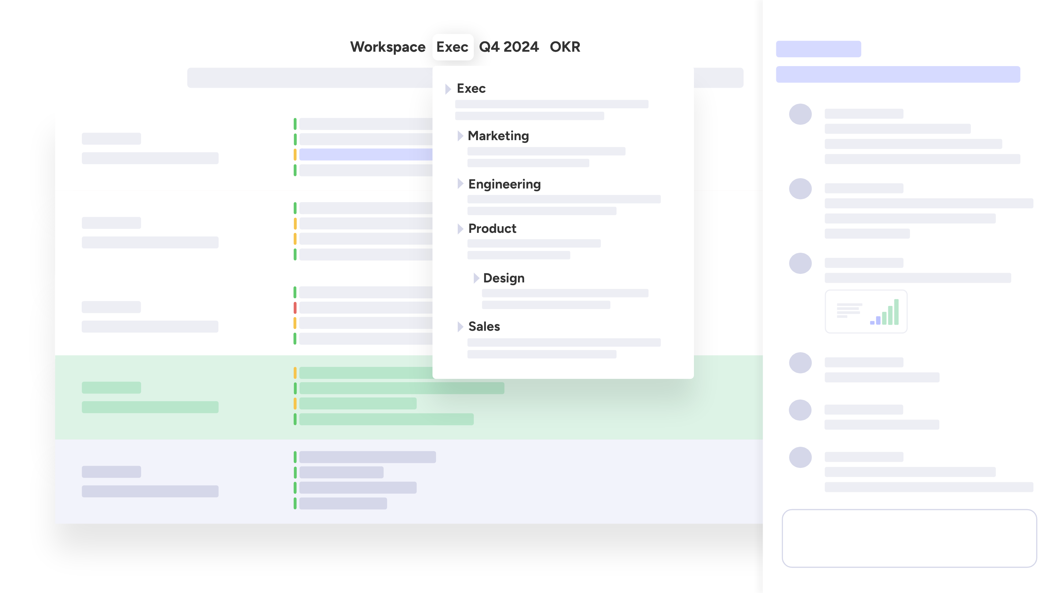 Mission > Objectives > Team Ownership > Key Results > Metrics > Values + Updates, Collaboration, and AI.